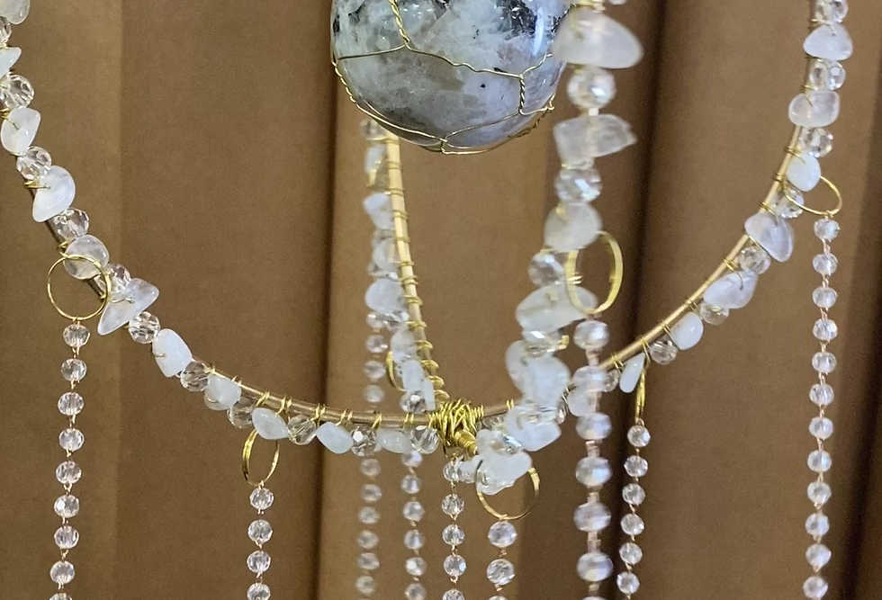 Ideal for hanging in windows, in a sunlit corner, or as a striking décor piece, the Moonstone Double Hoop Sun Catcher is a beautiful and meaningful addition to any room. Whether as a thoughtful gift or a personal touch, this sun catcher brings both beauty and healing energy into your home.